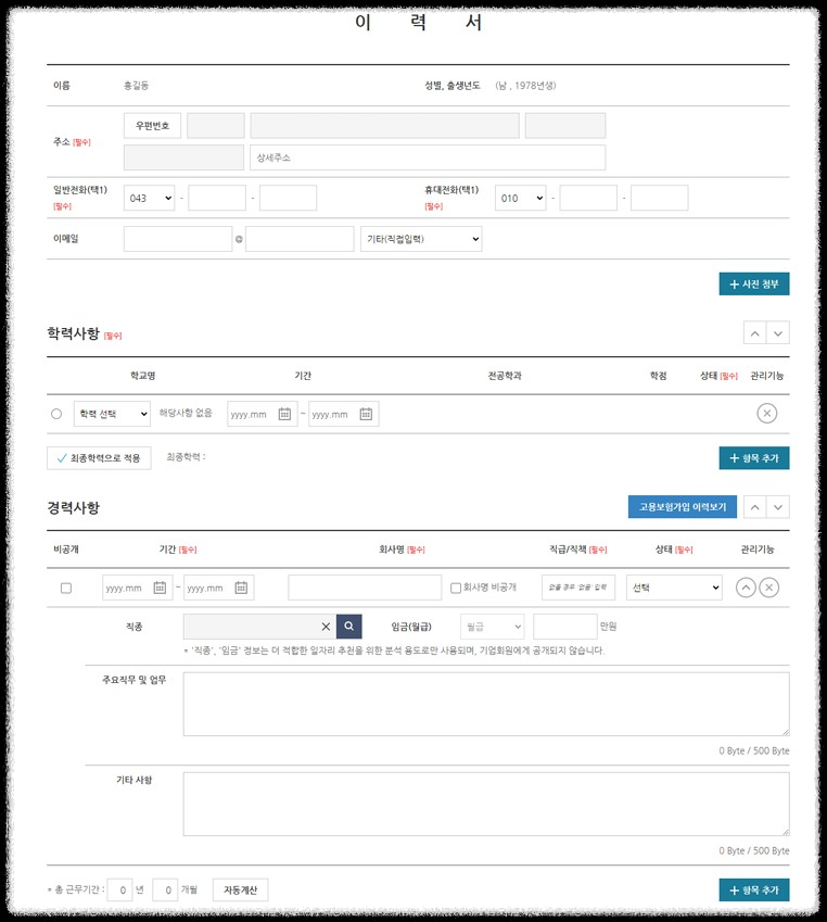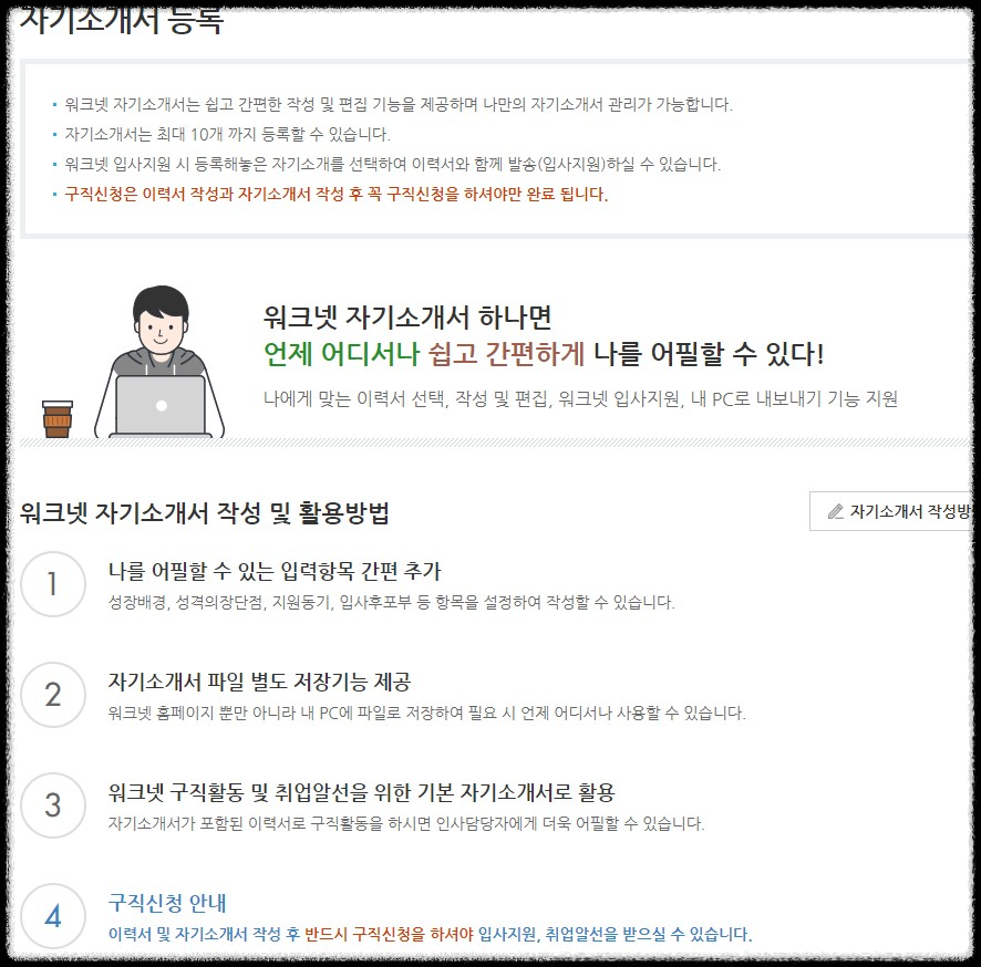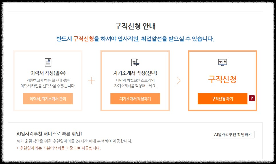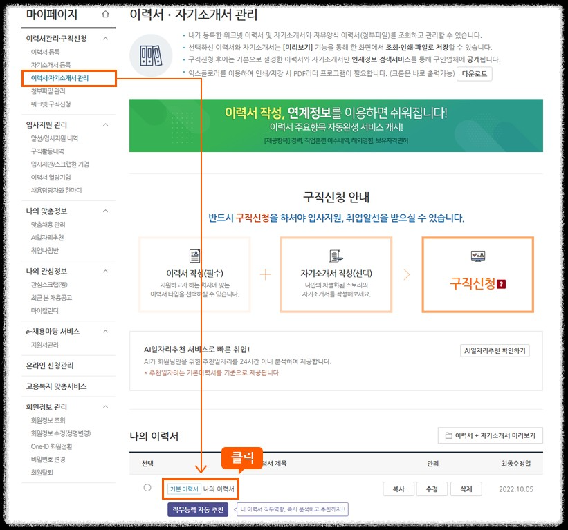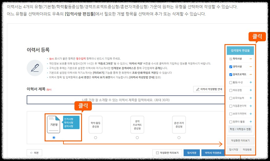 ㉴ 하단에 있는 "이력서 작성하기" 버튼을 눌러주세요.