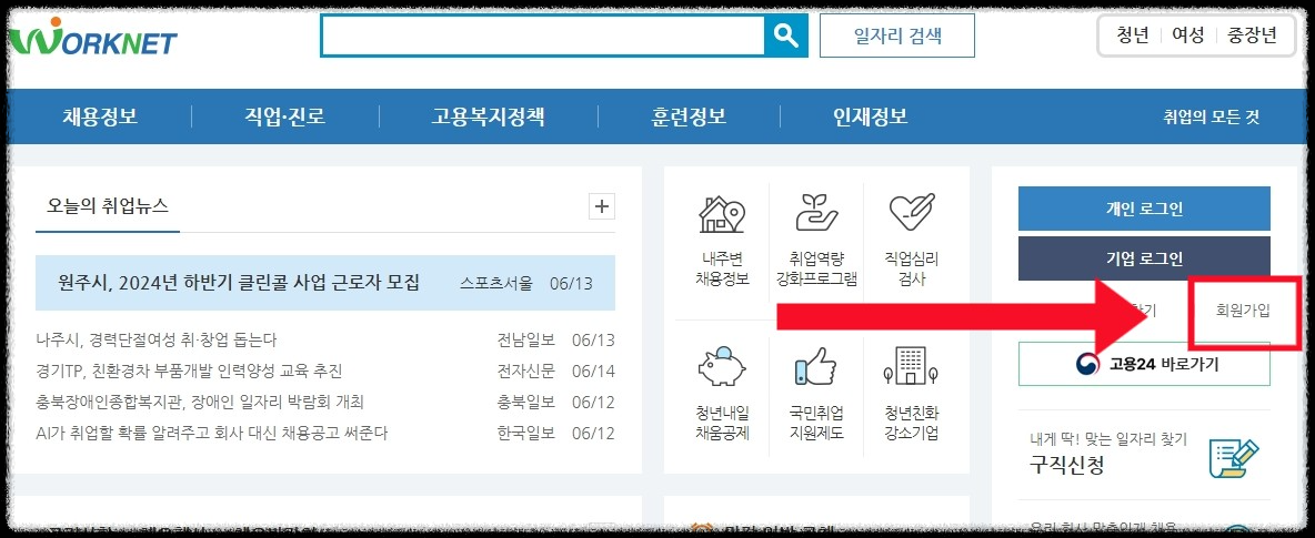 ㉮ 워크넷 홈페이지에서 로그인버튼 밑에 회원가입을 눌러주세요.