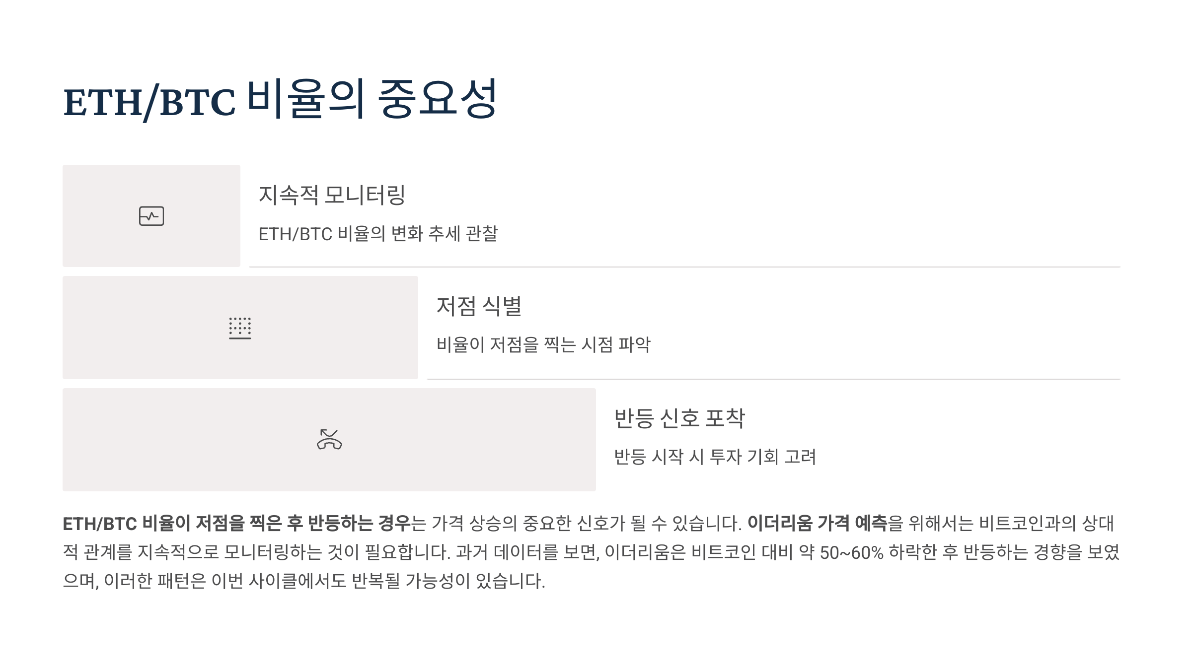 📈 2025년 이더리움 가격 예측을 위해서는 ETH/BTC 비율의 변화를 주의 깊게 살펴보는 것이 필요합니다.