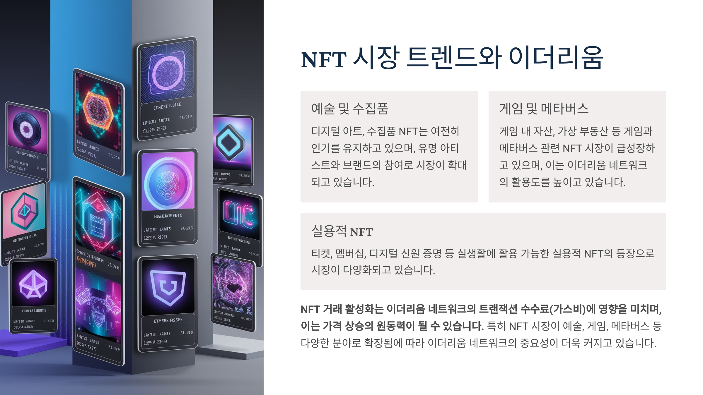 - NFT 거래 활성화는 이더리움 네트워크의 트랜잭션 수수료(가스비)에 영향을 미치며, 이는 가격 상승의 원동력이 될 수 있습니다.
