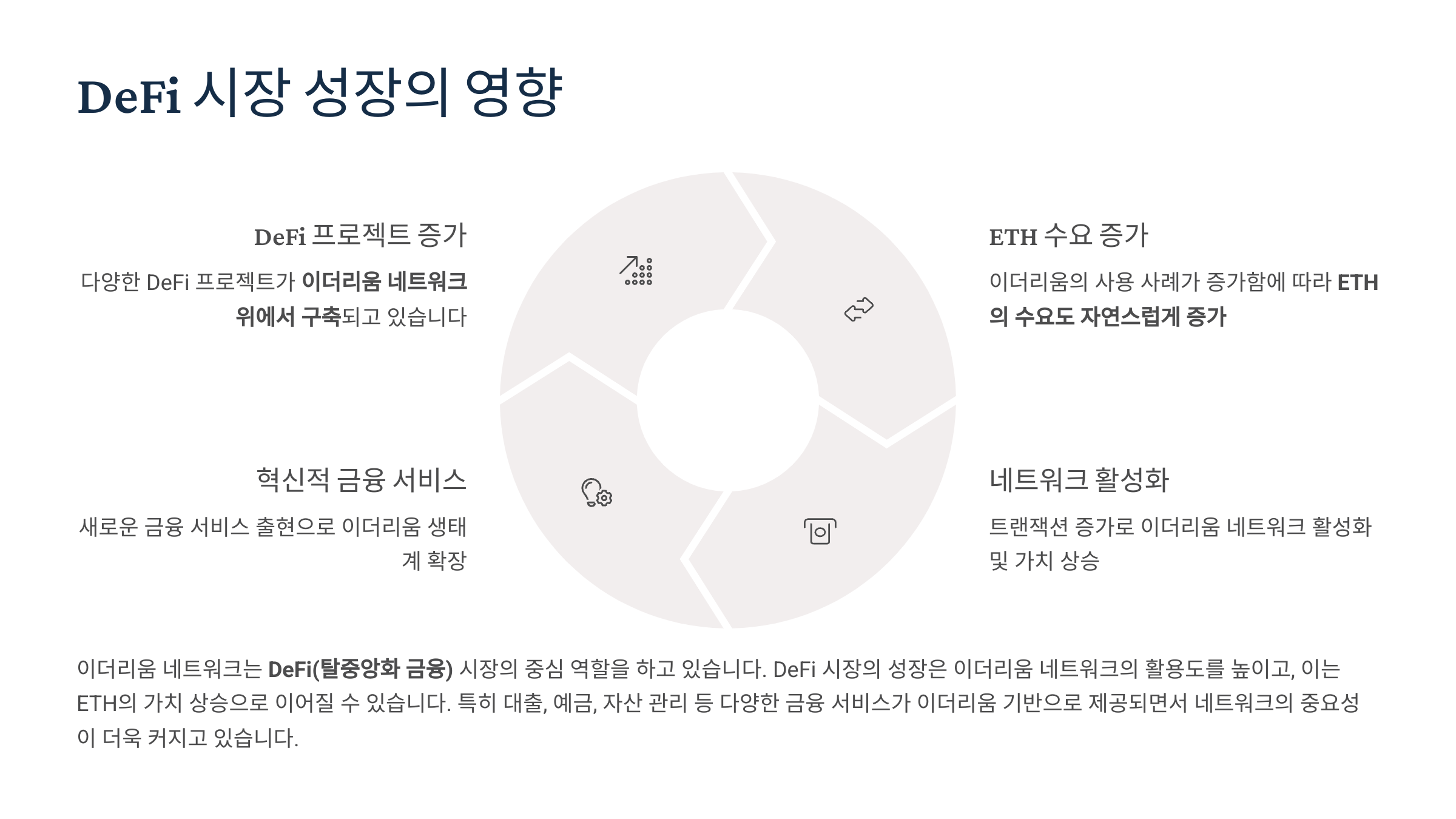 이더리움 네트워크는 DeFi(탈중앙화 금융)와 NFT(대체 불가능 토큰) 시장의 중심 역할을 하고 있습니다.