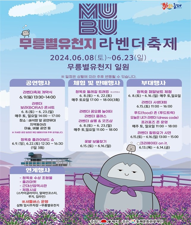 무릉별유천지는 오는 8일부터 23일까지 라벤더 축제를 개최합니다. 올해 2회째를 맞이한 라벤더 축제는 개최 기간을 기존 3일에서 16일로 늘려 국내외 손님을 맞이할 준비를 마쳤습니다. 축제 기간 동안 다양한 체험 행사와 벼룩시장, 보라 콘서트 등이 열립니다.